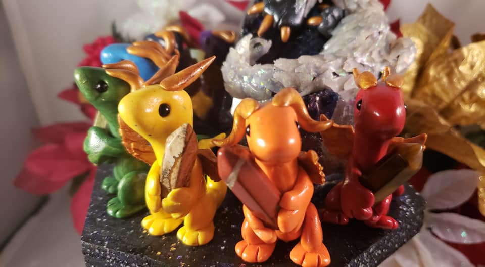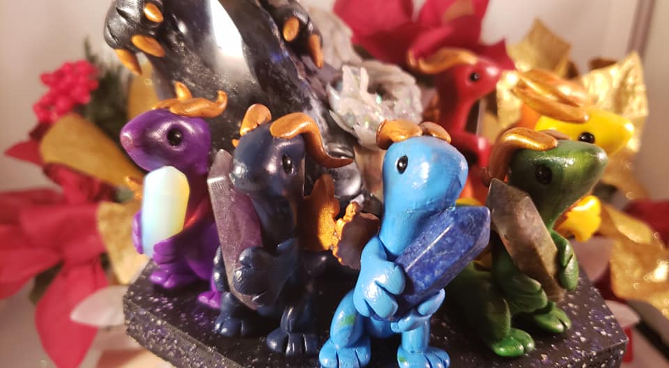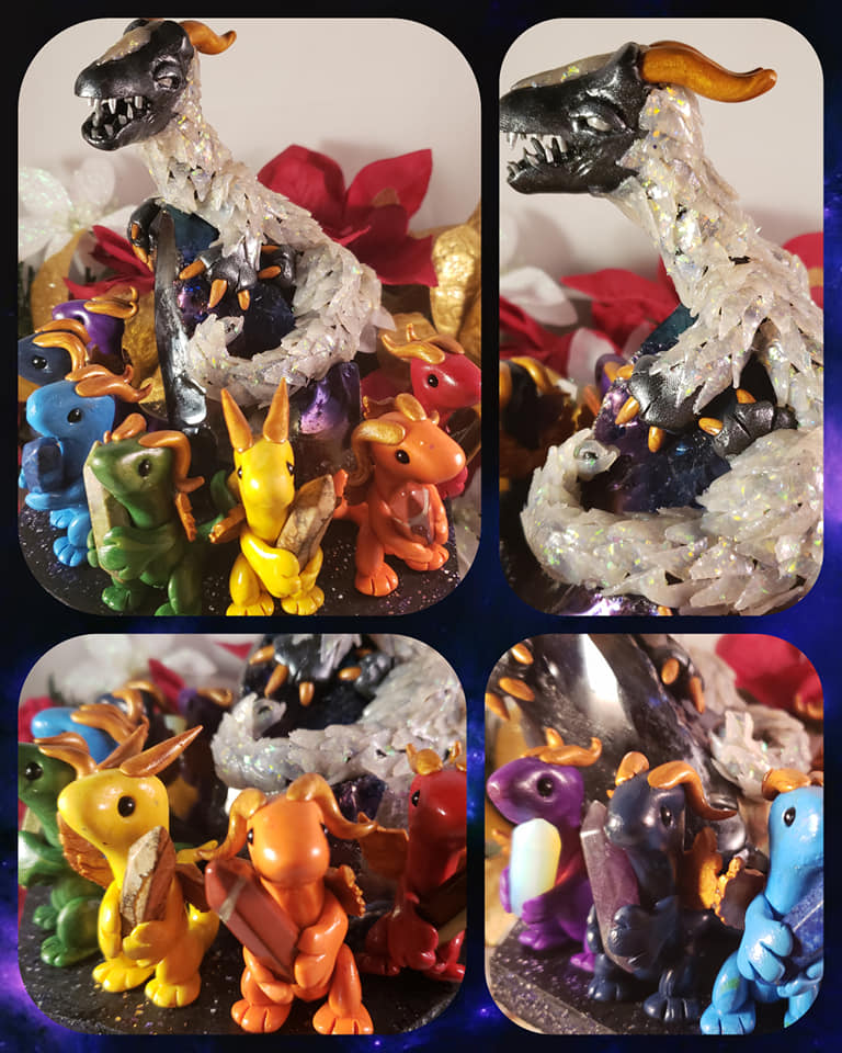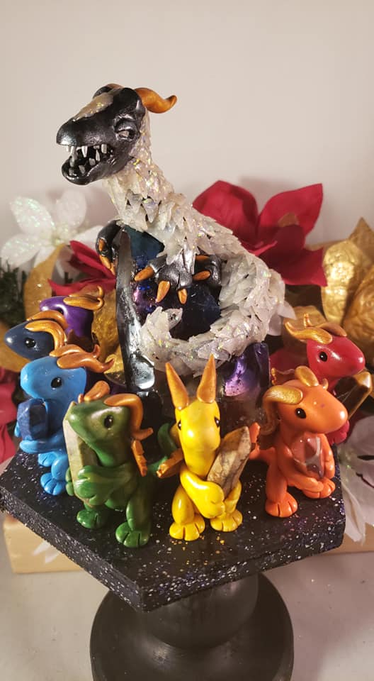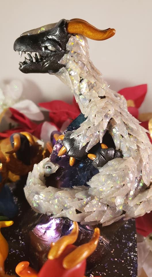 The large dragon, glittering with opalite scales and howlite eyes, looks out to the rest while sitting on a large glass rock, representing the soul.