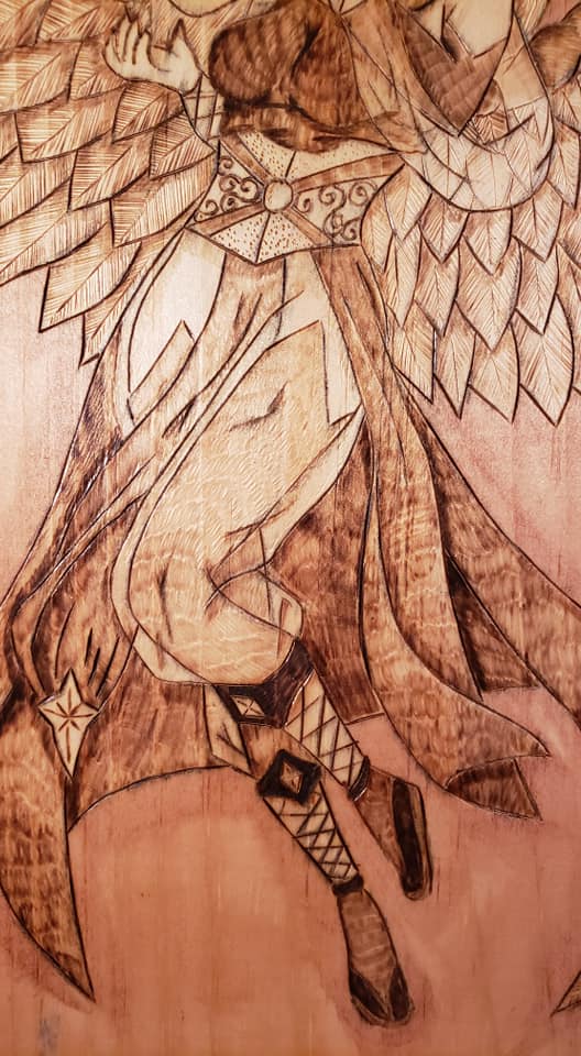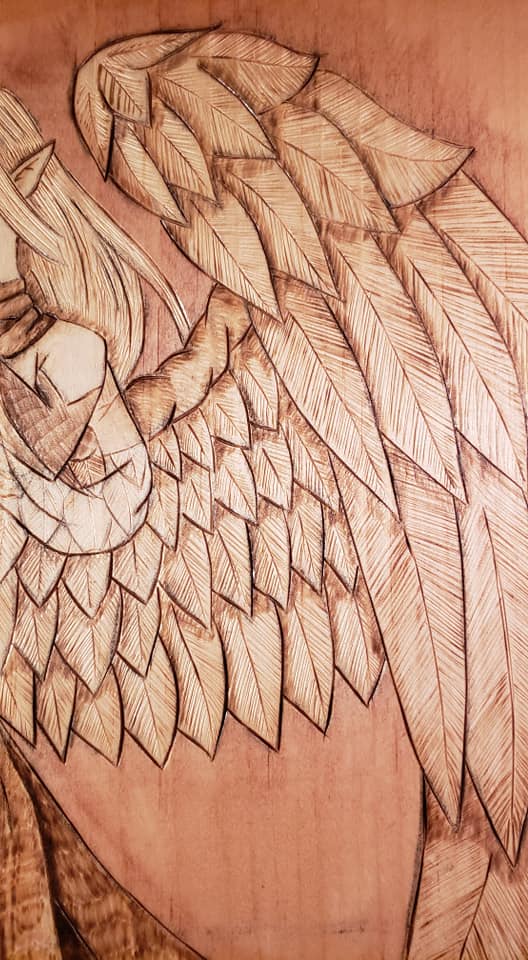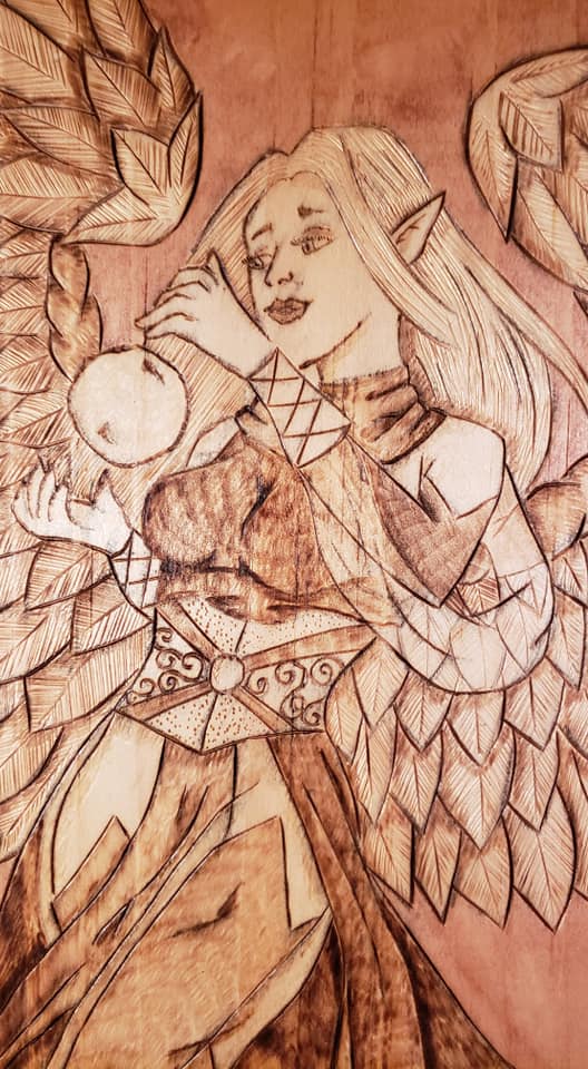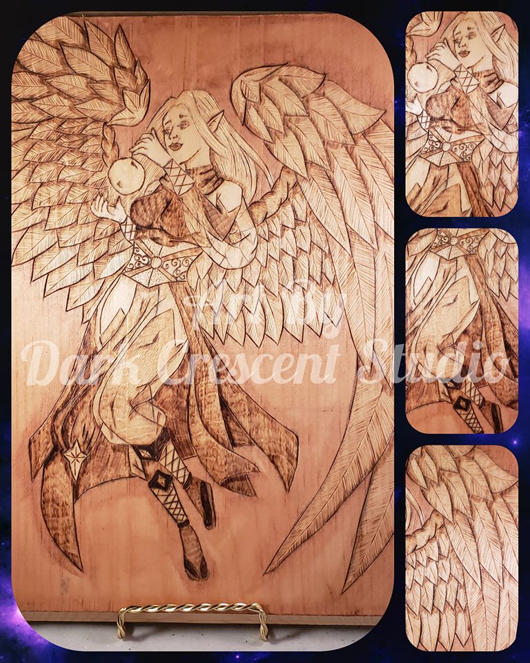 Angel's Grace is a 9"x12" hand burned plaque. It's been partially stained, and features many fun and heavily detailed parts to it. I had so much fun burning this piece, and I hope it makes its way into a loving forever home.