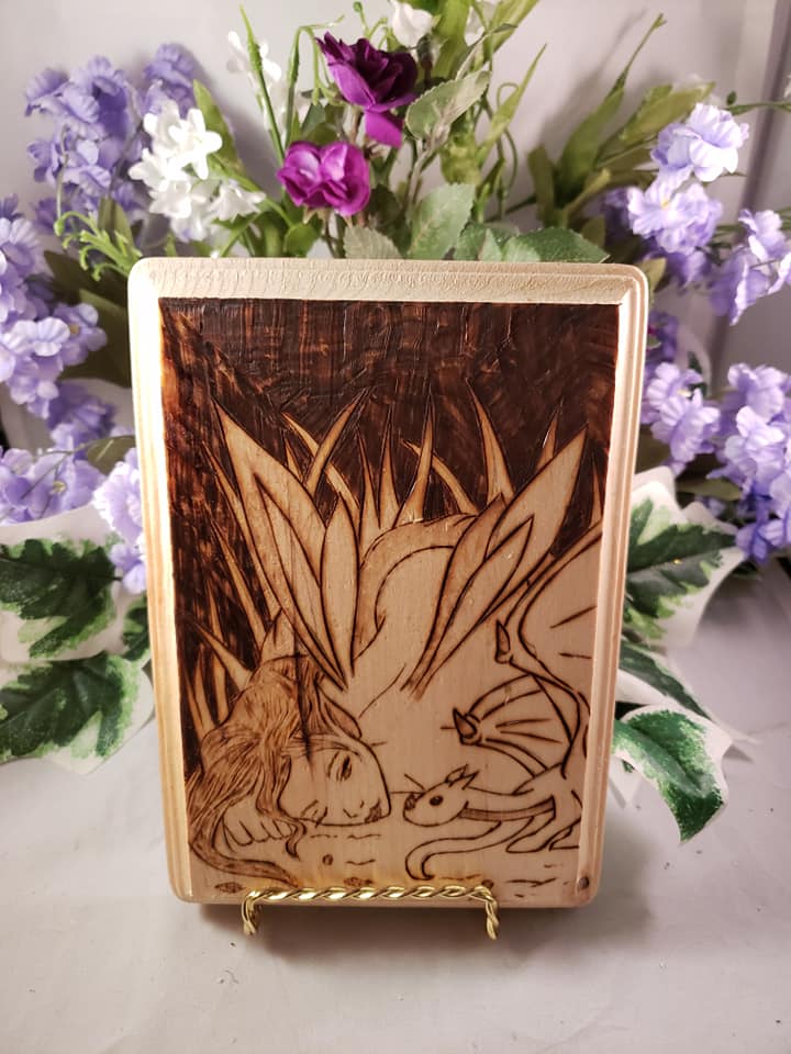 Dark Crescent Studio's pyrography designs are all done individually by hand through heated tools rather than with a laser cutter, so each piece is 100% unique and custom made-perfect for adding that special touch to a gift, or for a piece for your home.