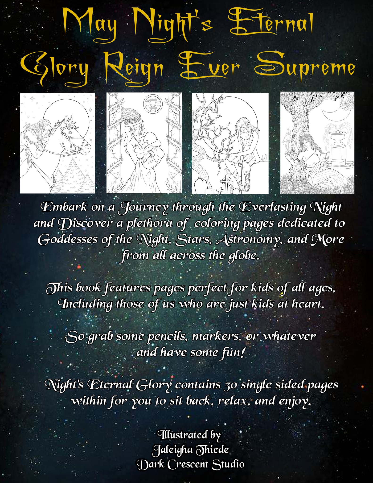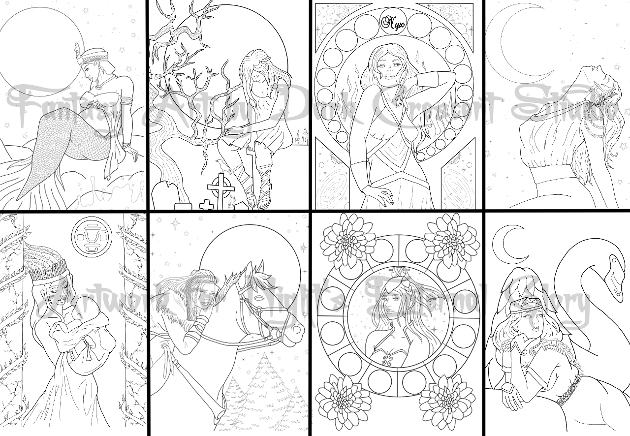 After another almost two year long project~Night's Eternal Glory is finally done, cleaned, and in print!! FIRST RUN COPIES ARE HERE AND IN STOCK with next run pre-orders up!! This particular coloring book features 30 glorious images, all dedicated to Goddesses of the Night from lore all across the globe