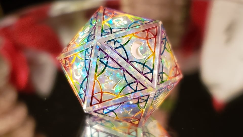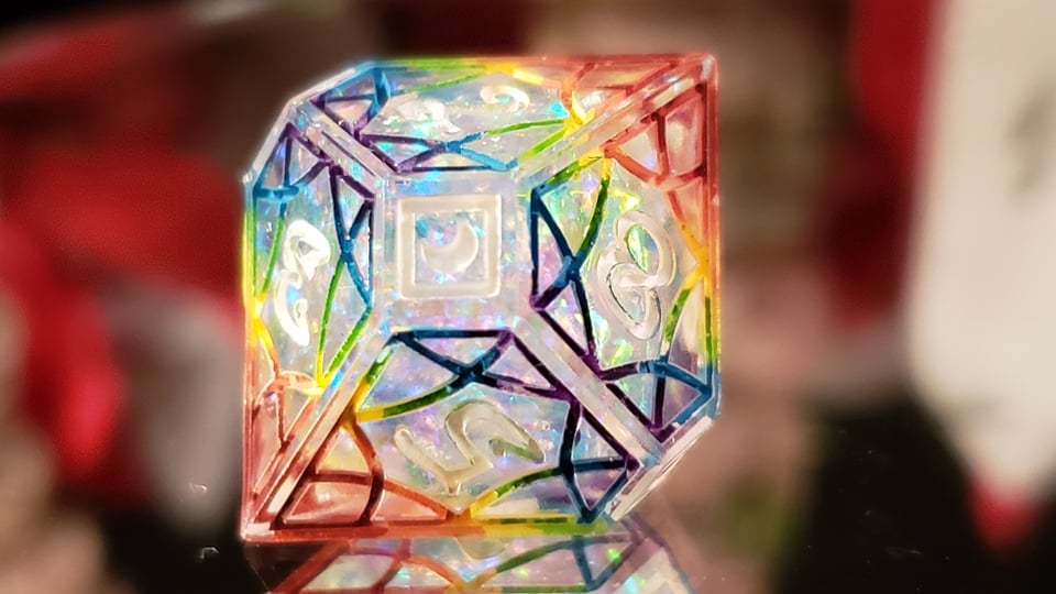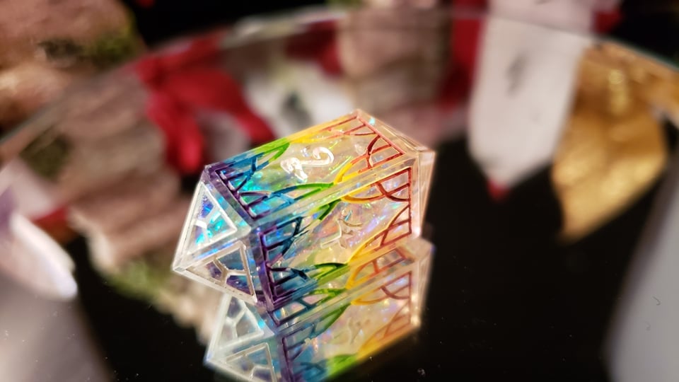 This set is mostly clear, with a heavy opalized center and is inked in a rainbow on each individual face and numbered in white. Due to the nature of visibility, if you would like to request a different numbering color, feel free to in the notes section of checkout.