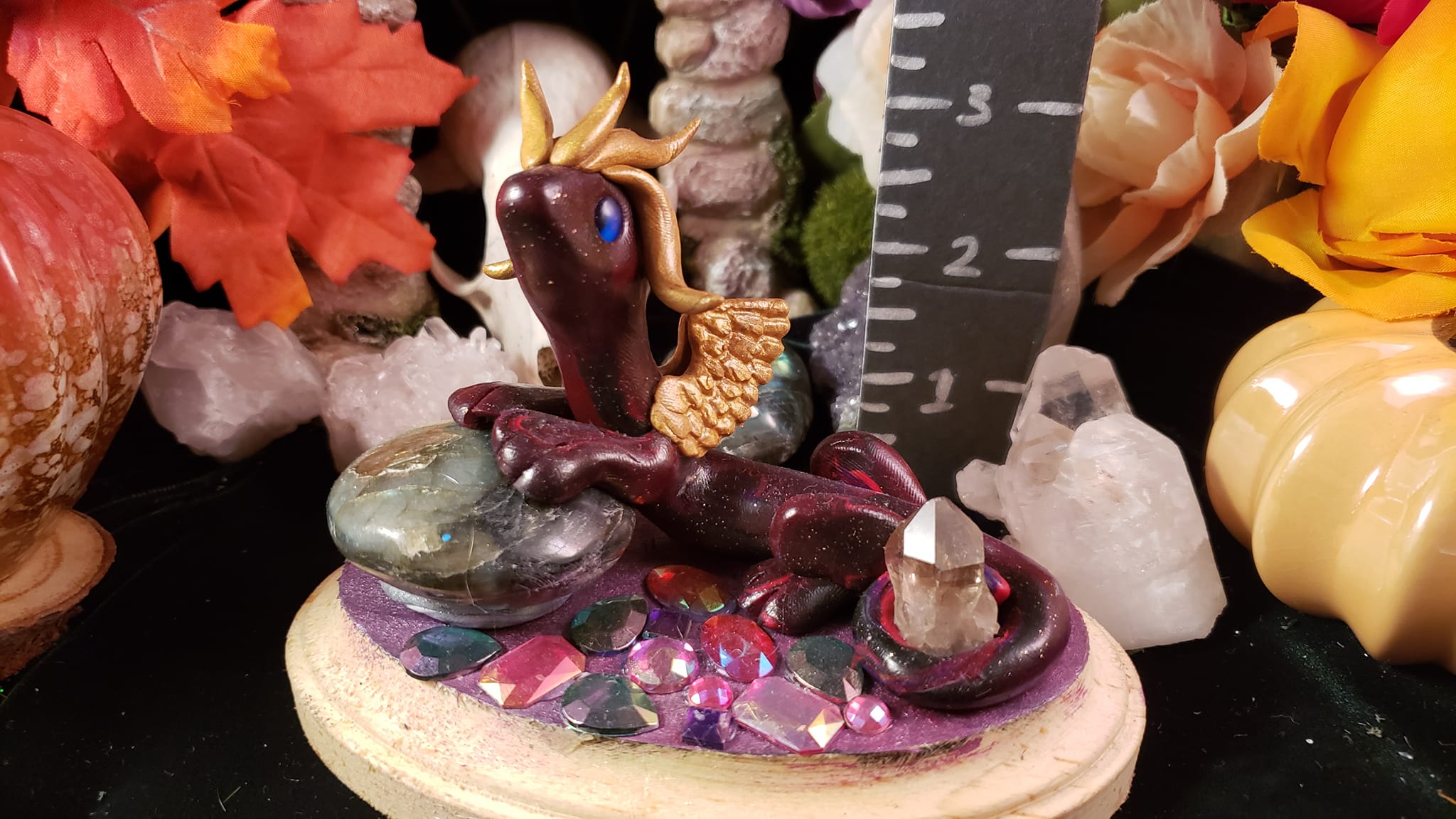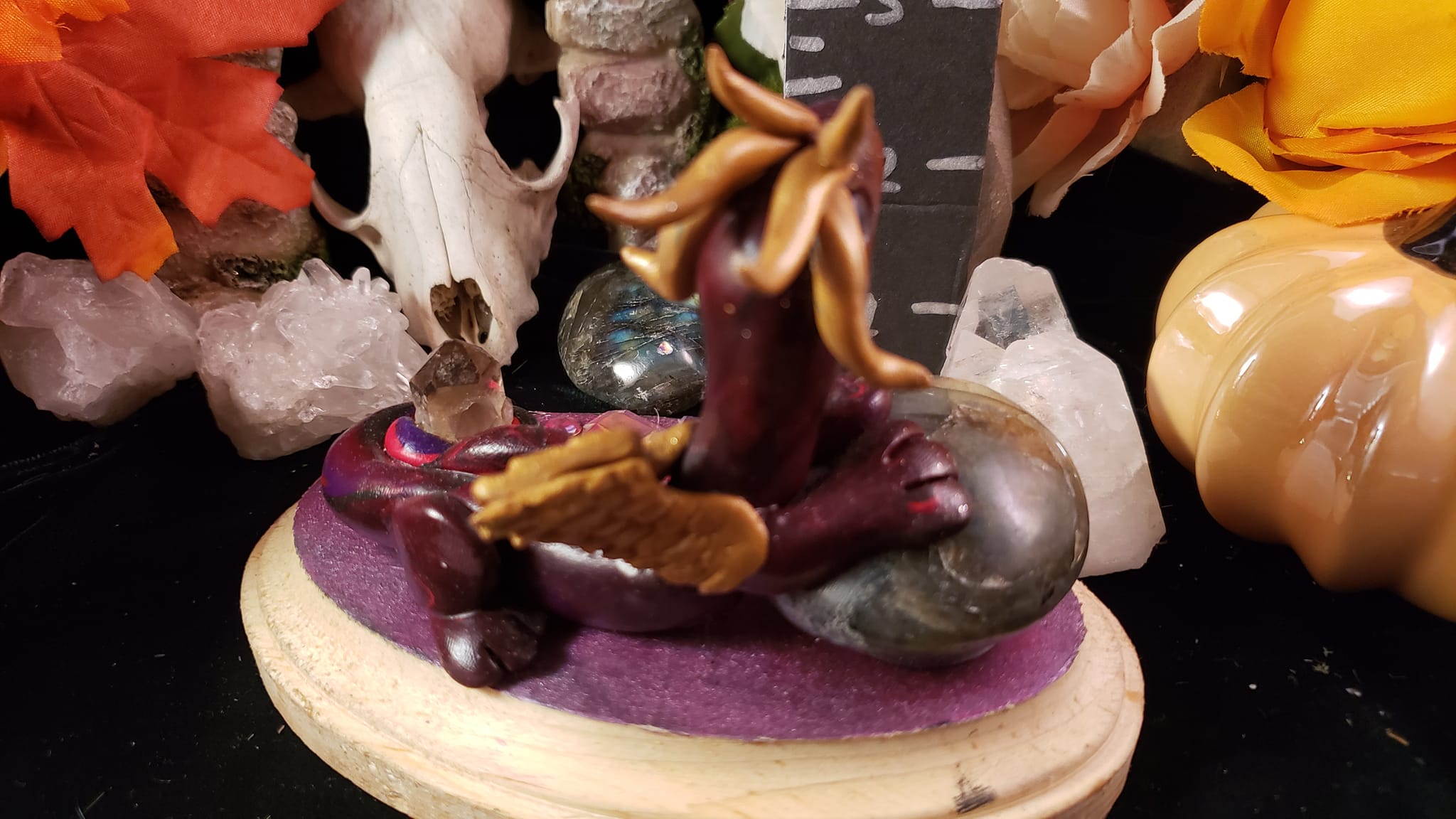 This sweet little dragon rests along a labradorite palm stone and has its tail wrapped around a smoky quartz cluster.