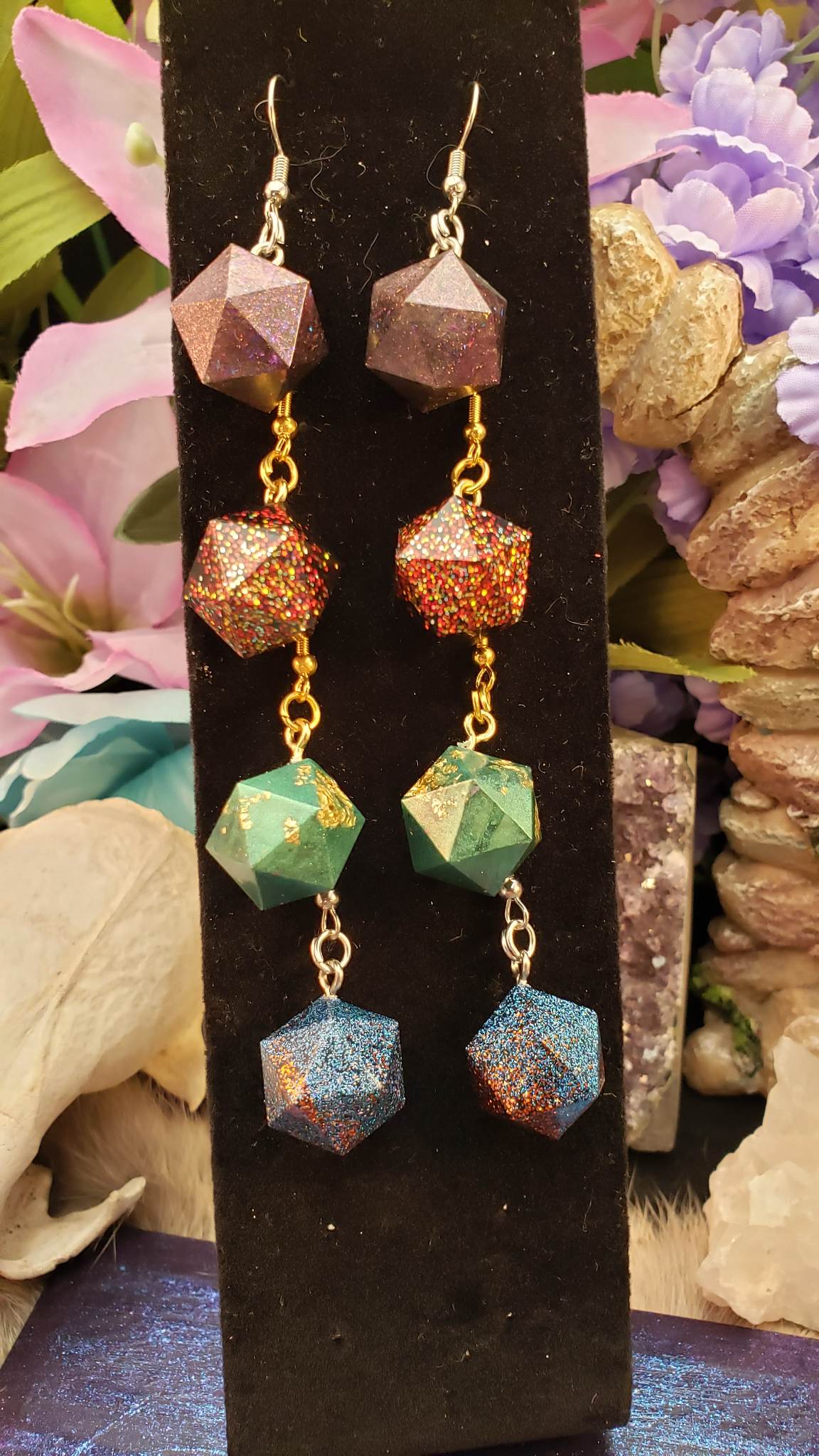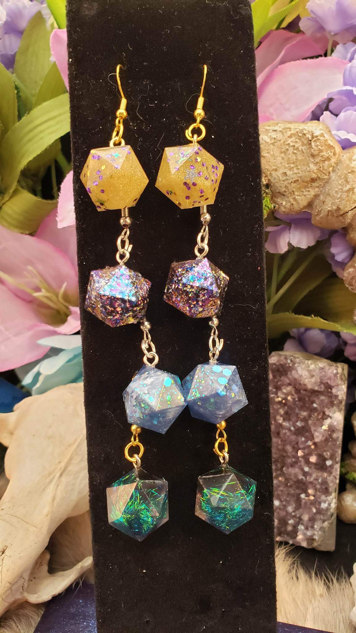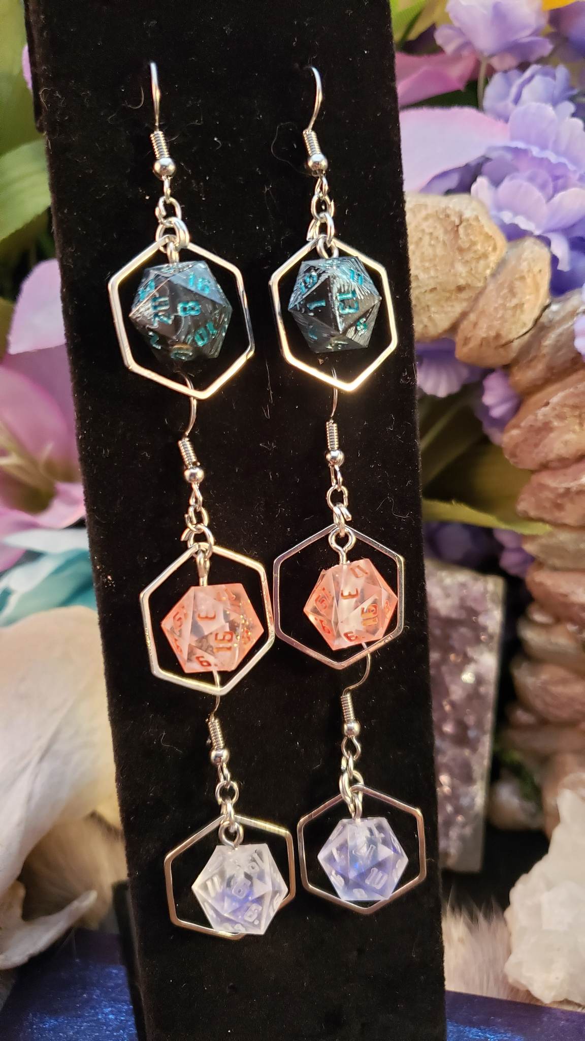 **Hex Dice Earrings--these have the gold or silver hexagons with matching fastenings and the numbered 12mm d20s