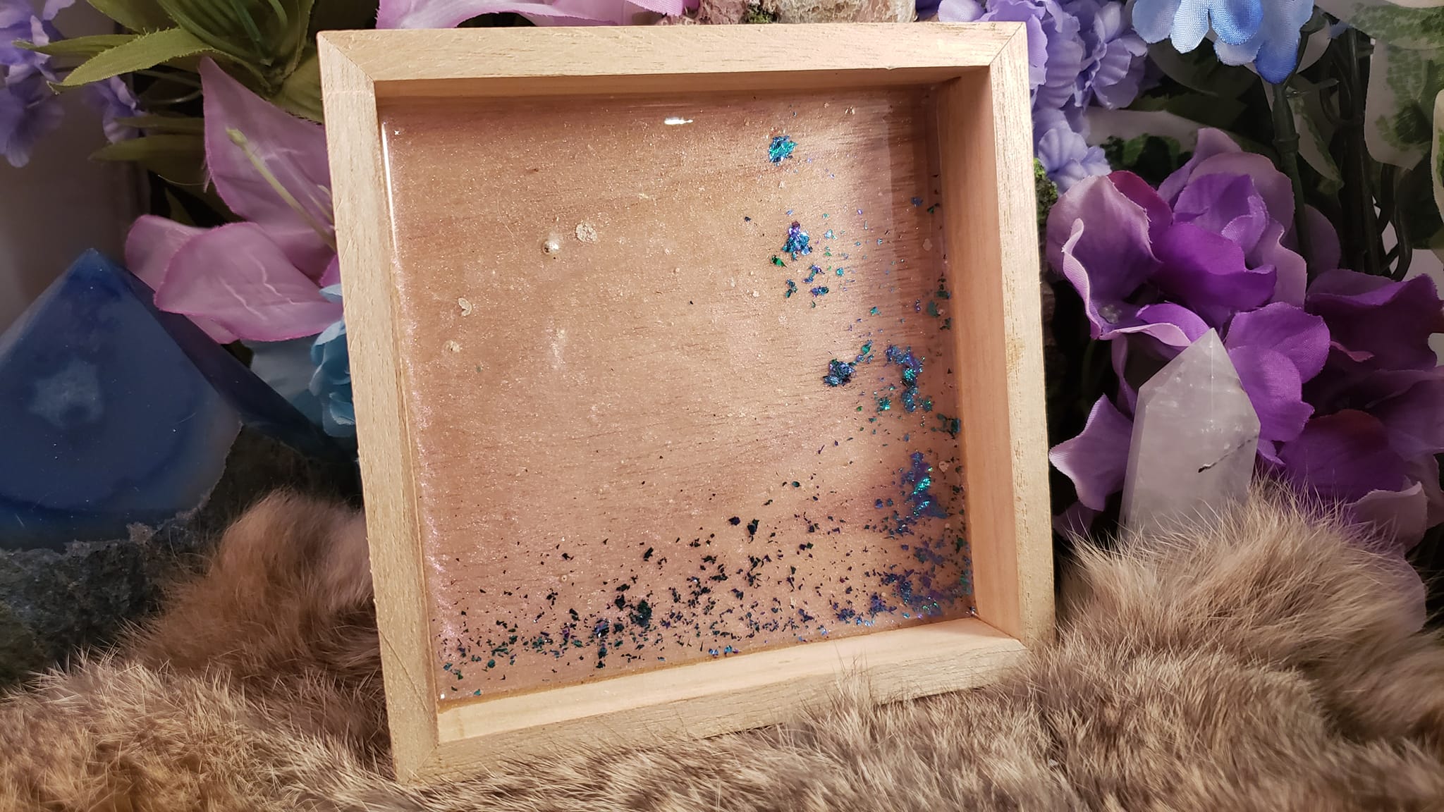 This personal dice tray is perfect for taking on the go and gamers with not a lot of space at your table to roll at. It measures at just over 1x5x5 inches overall. Hand poured with a thin coat of resin in shifting colors and sparkles to bring a unique look to your tray