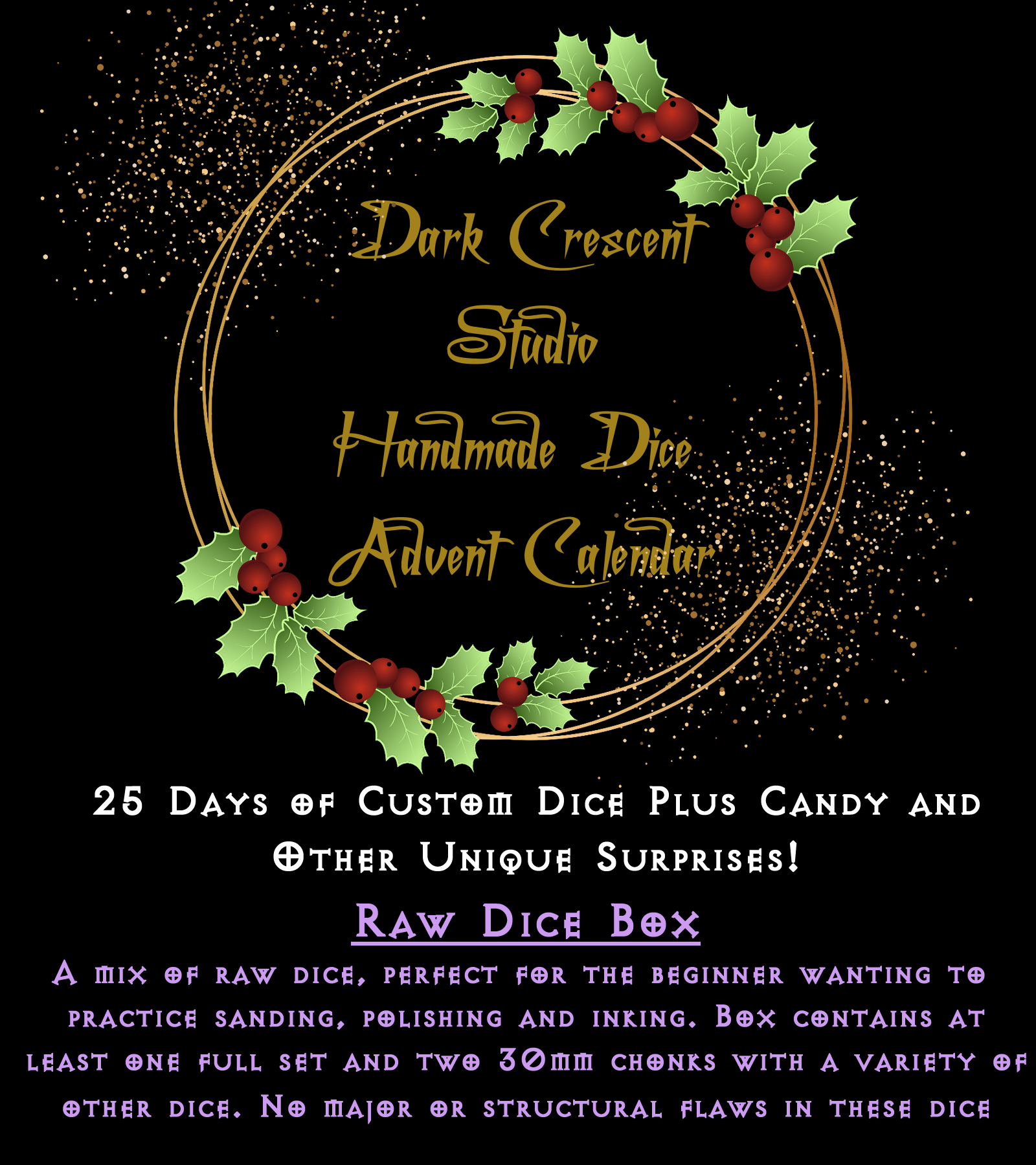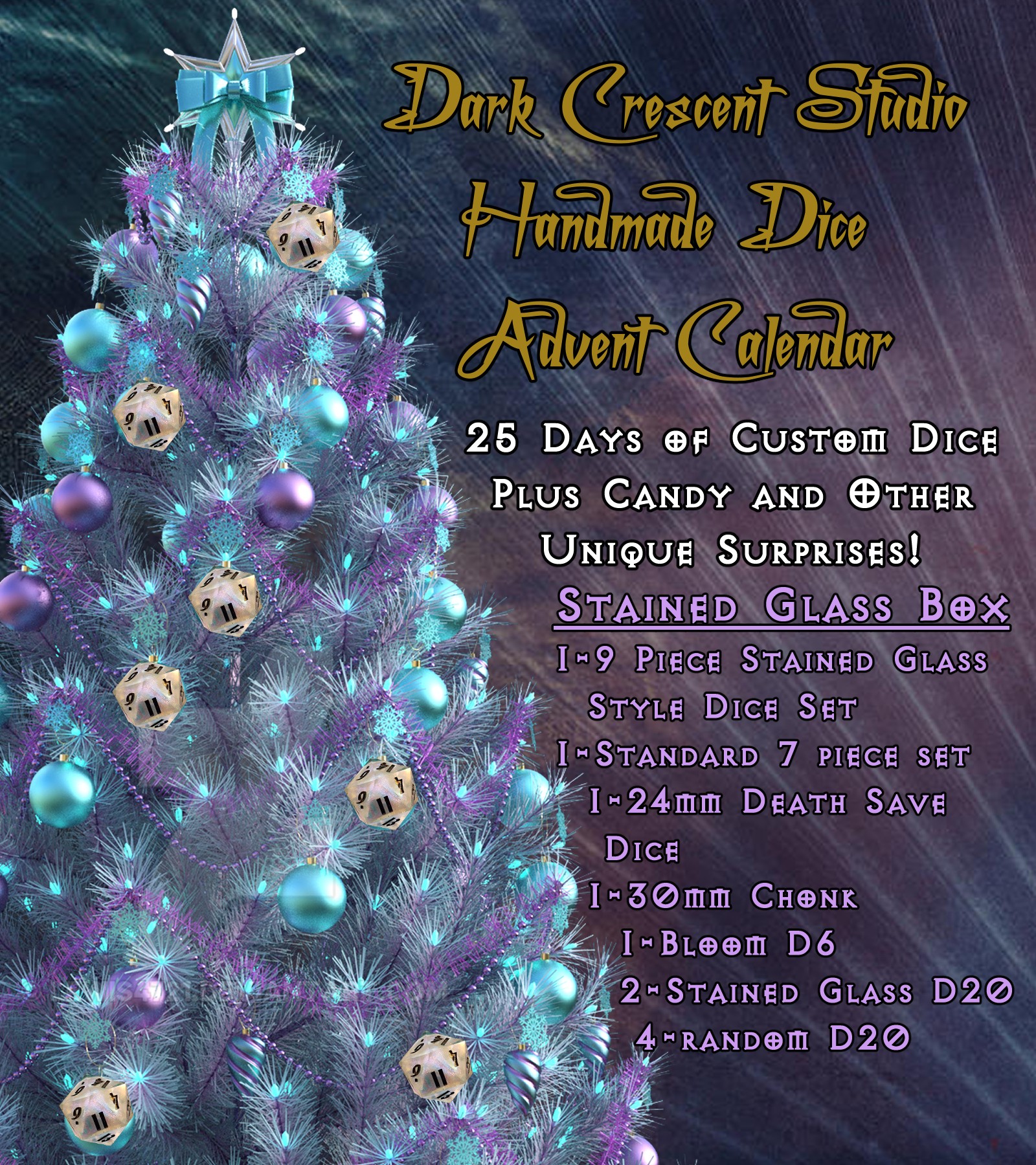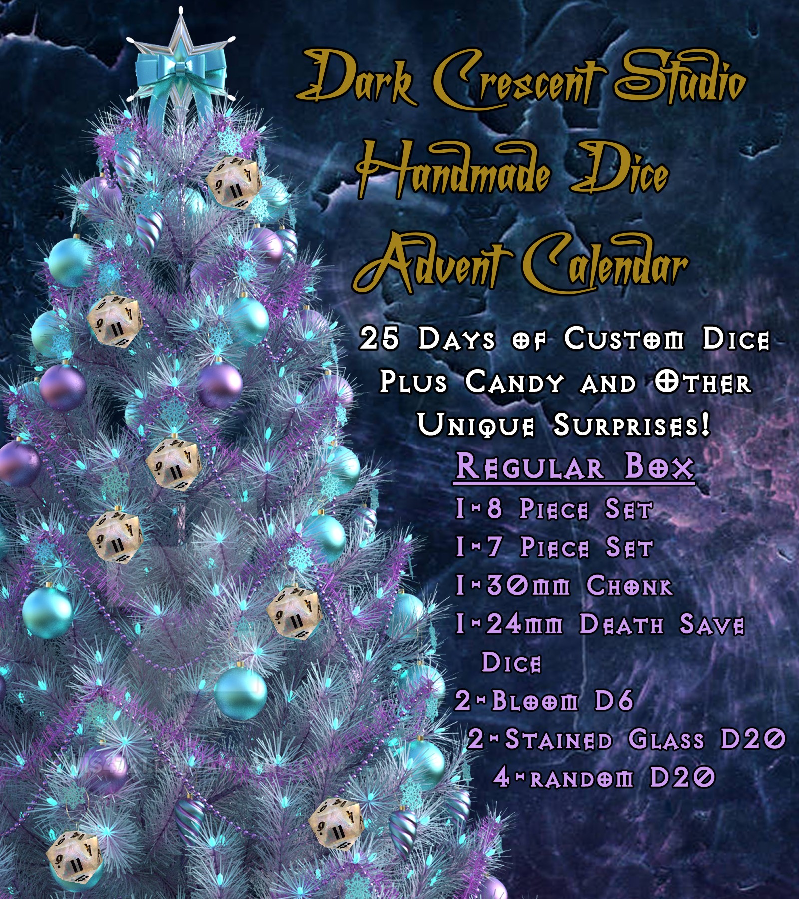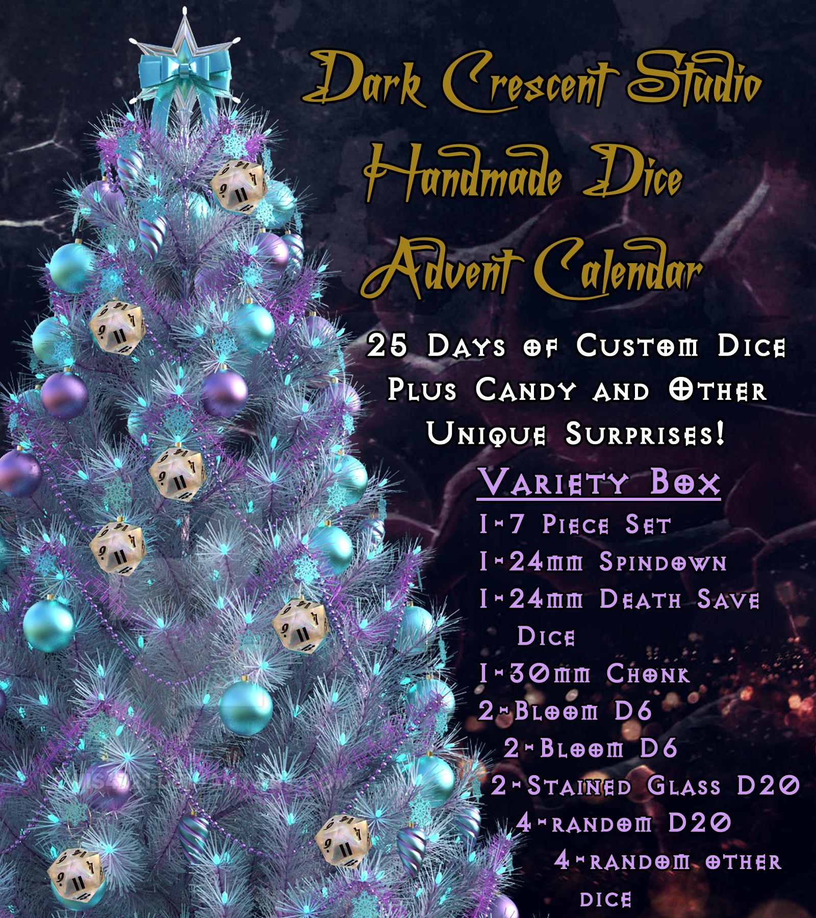 I have mapped out 4 different options, each unique and offering at least one if not more full sets of dice and other fun options within each box along with a small variety of candy!! All the dice will be newly made fun stuff and you'll get to unwrap a dice a day ranging from standard to whimsy and more!