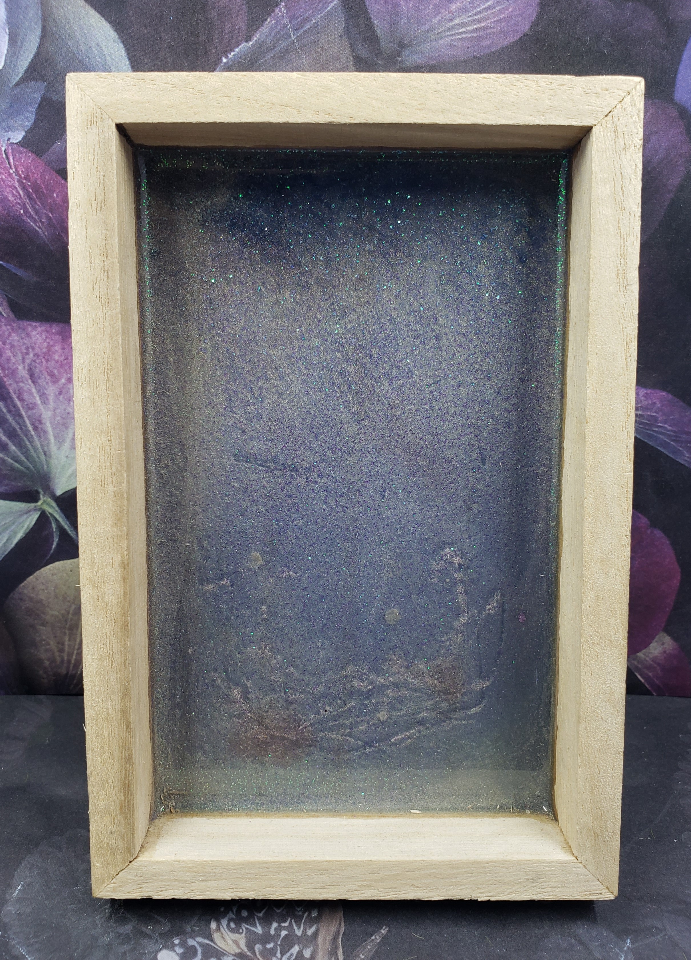 This personal dice tray is perfect for taking on the go and gamers with not a lot of space at your table to roll at. It measures at just over 1x4x5 inches overall. Hand poured with a thin coat of resin in shifting colors and sparkles to bring a unique look to your tray