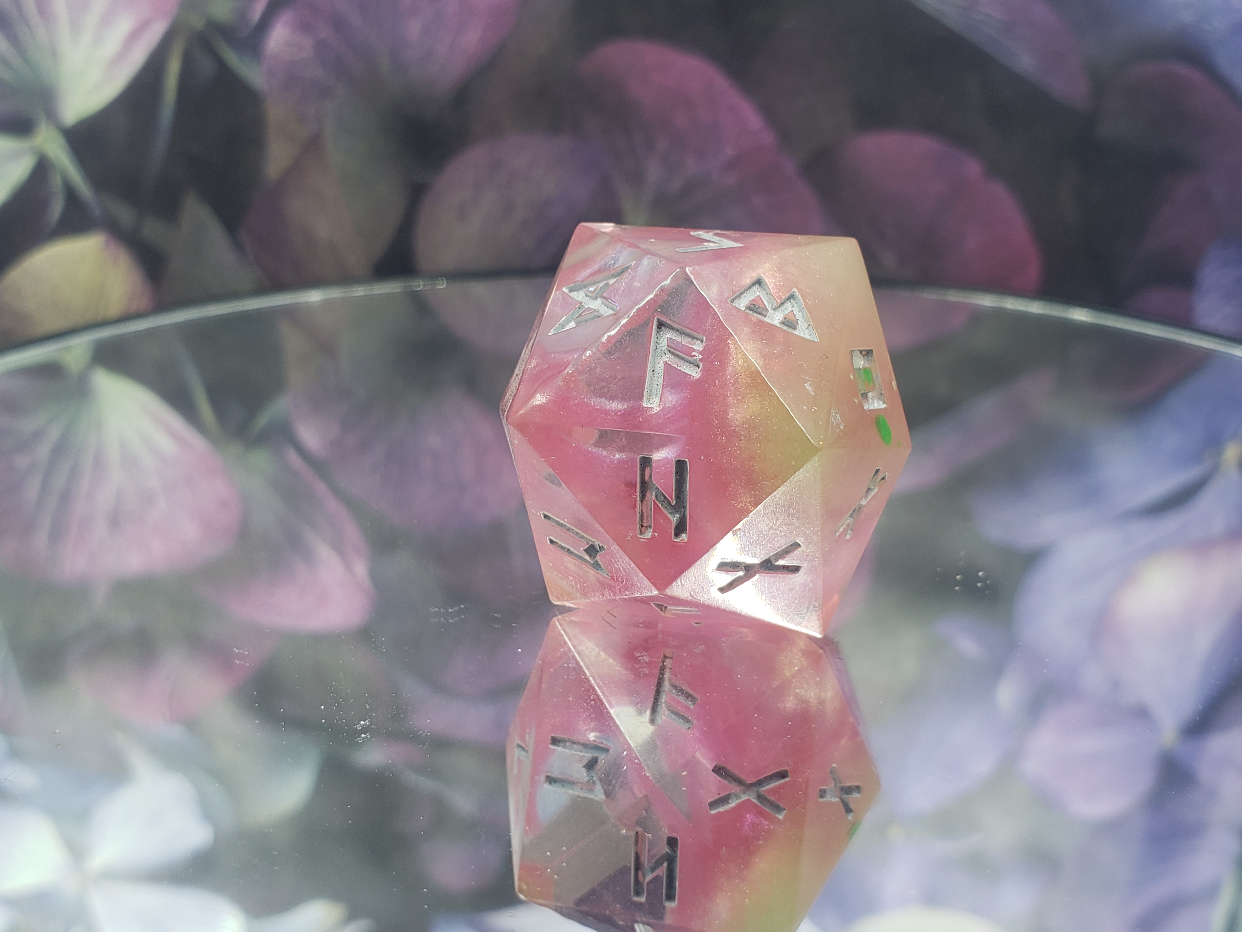 This rune features a clear dice with a light pink and green drop through and is inked in pale lavender