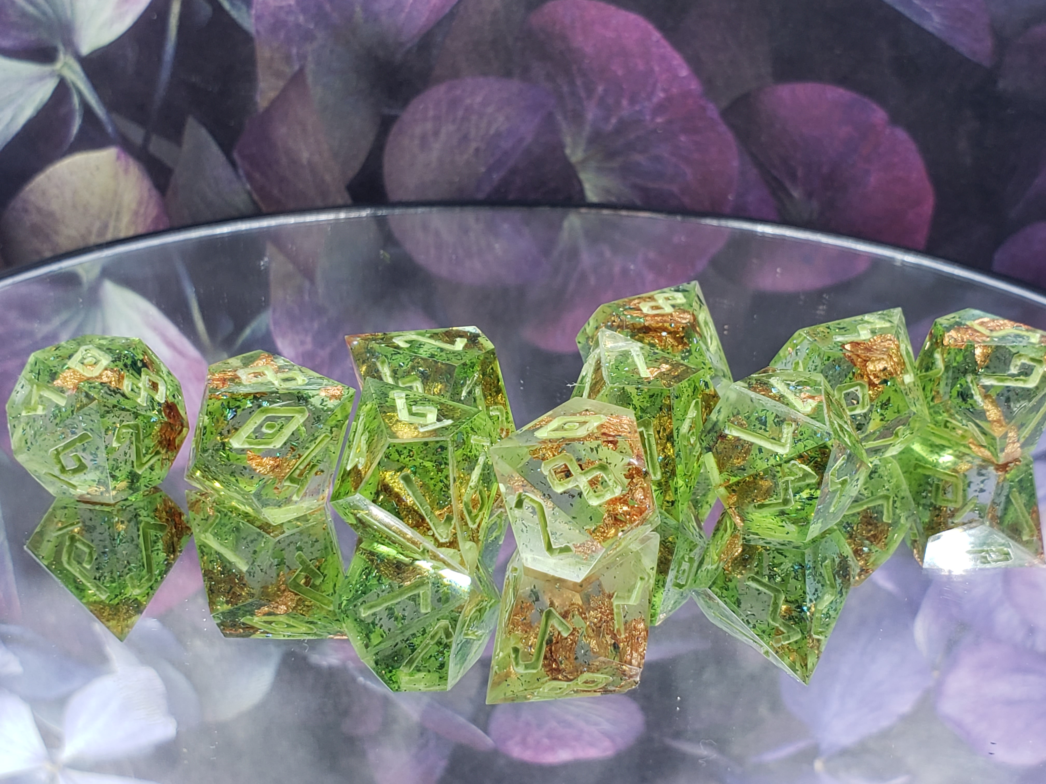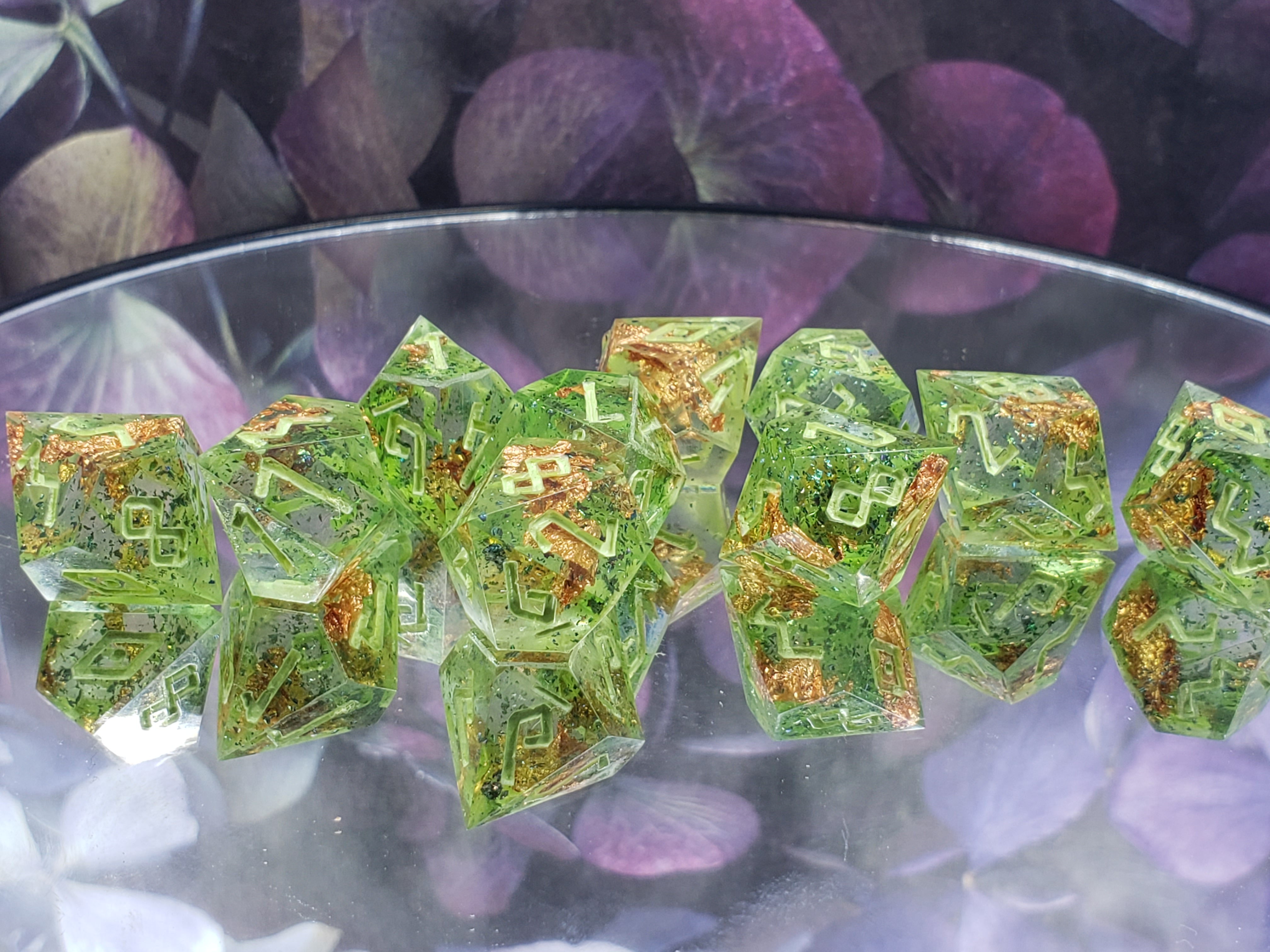 This set features a translucent light green base with floating flecks of gold flakes and bright glitter with pale green inking.